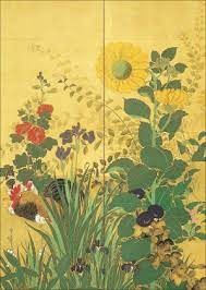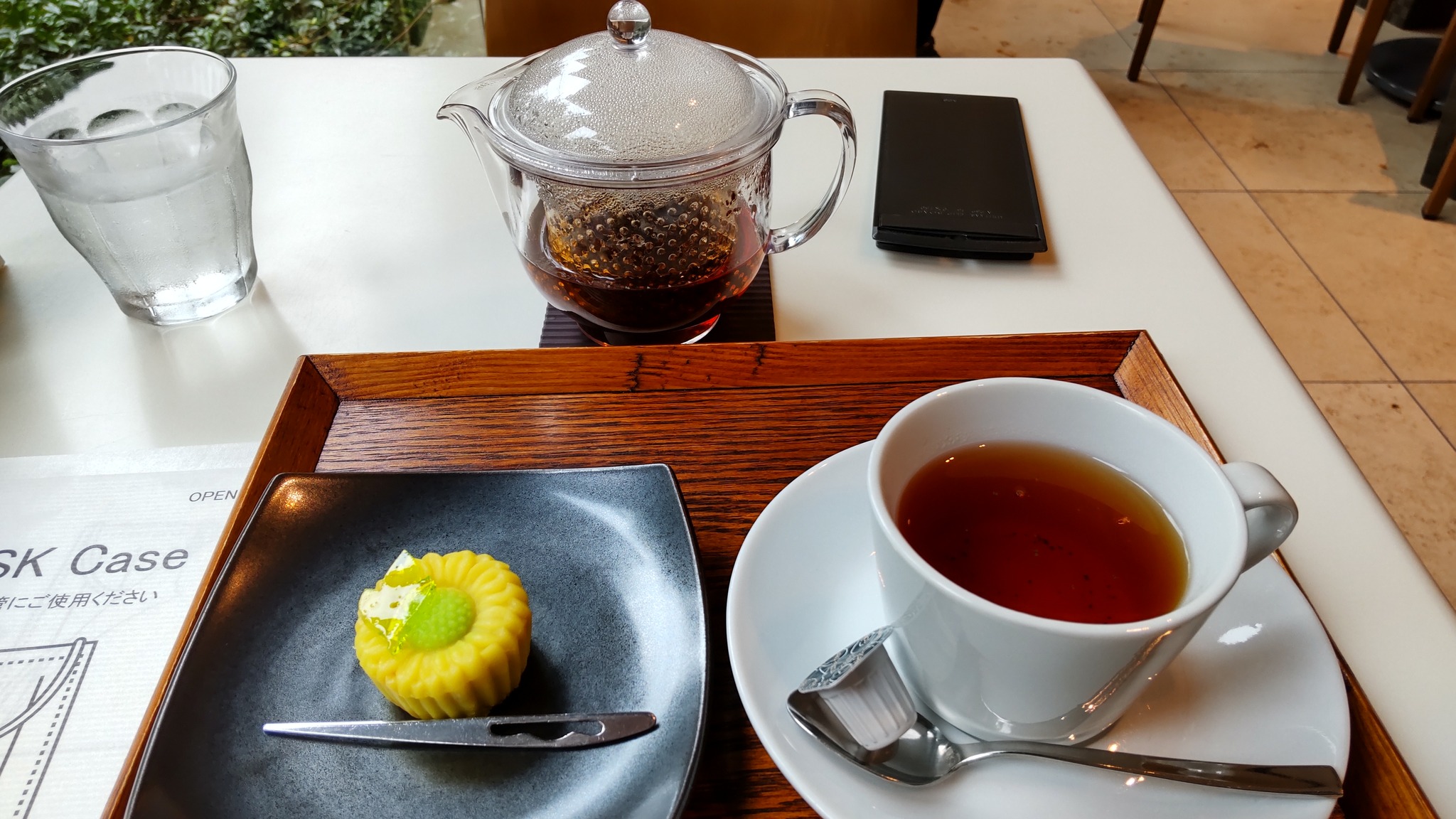 山種美術館のカフェで和菓子とお茶をいただきました。開催中の「浮世絵・江戸絵画名品選ー写楽・北斎から琳派まで」に展示されていた、鈴木其一「四季花鳥図」にちなんだメニューで向日葵をモティーフにしているそうです。